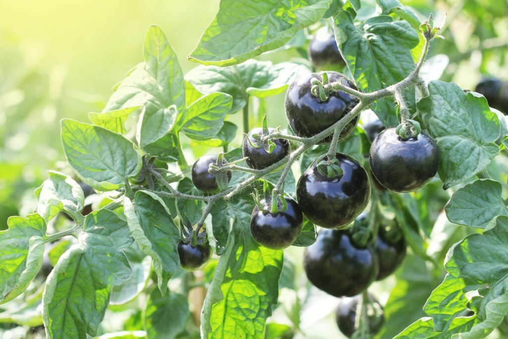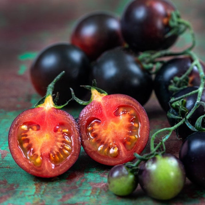 Produces small, round tomatoes with a deep, dark purple-black color.
