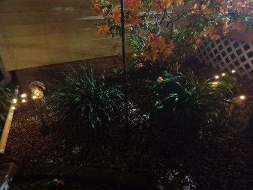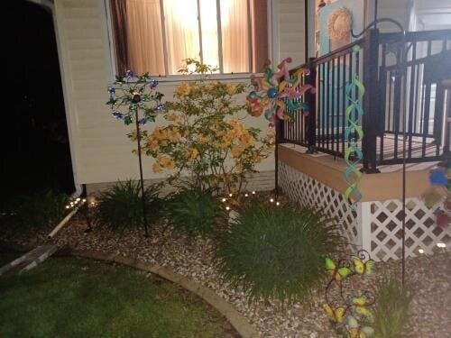 These solar lights are cute! I just have the two set up currently but they light up my walkway when my porch light isn't on. I wish they would flex a little better so that all the lights aren't so close. I think they would look really nice along the fence line mixed in with some bushes.
