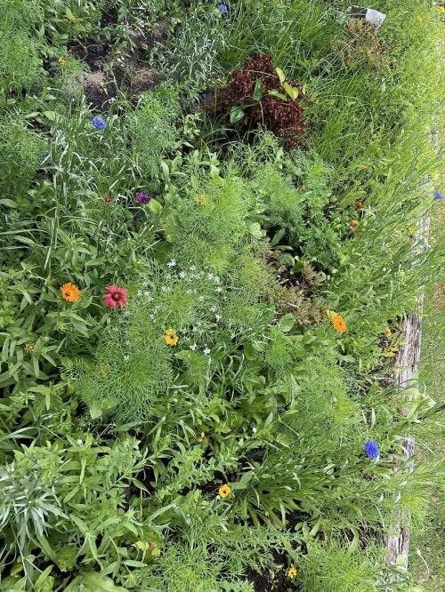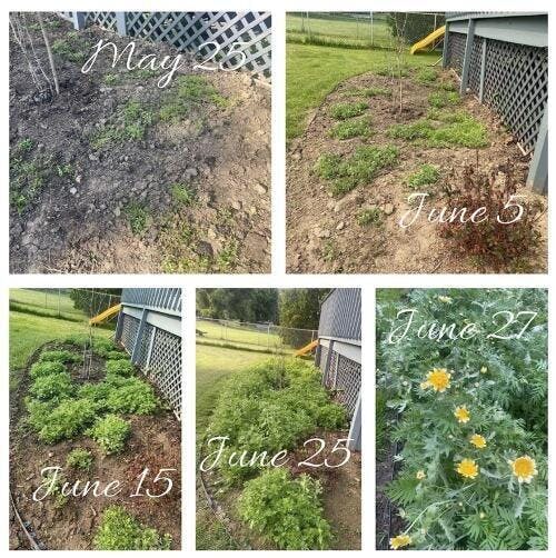The wildflowers grew quickly and I love them, though I'm currently struggling with the parasitic weed, Dodder, which is threatening the blooms. I'm dedicated to caring for my flowers, routinely checking and removing the vine, and have even created a sitting area to enjoy their beauty. I would definitely purchase again despite this challenge. The growth progress is evident from the photos taken a few weeks apart.