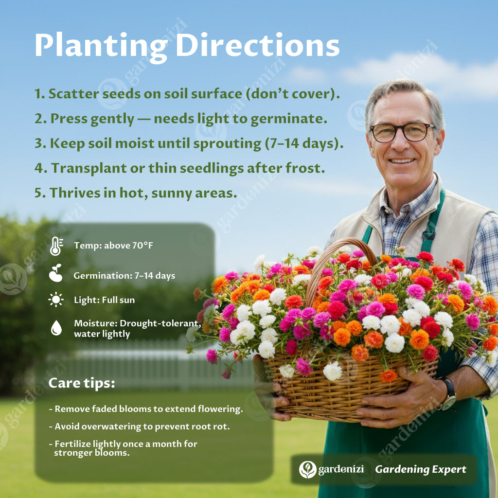 Start Moss Rose seeds directly outdoors after the danger of frost has passed, or sow indoors 6-8 weeks before the last frost. Scatter seeds on the soil surface and press gently without covering, as they need light to germinate. Keep the soil moist until germination occurs (7-14 days).Once established, Moss Rose requires minimal watering and thrives in hot, sunny conditions. It’s perfect for rock gardens, borders, or as ground cover.