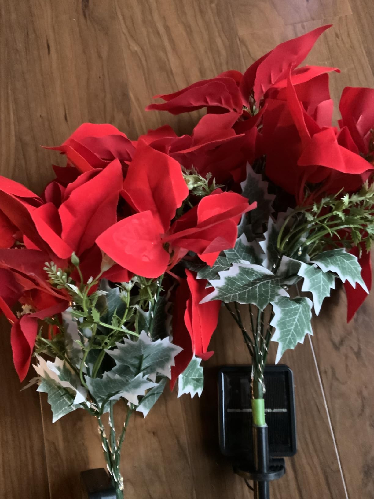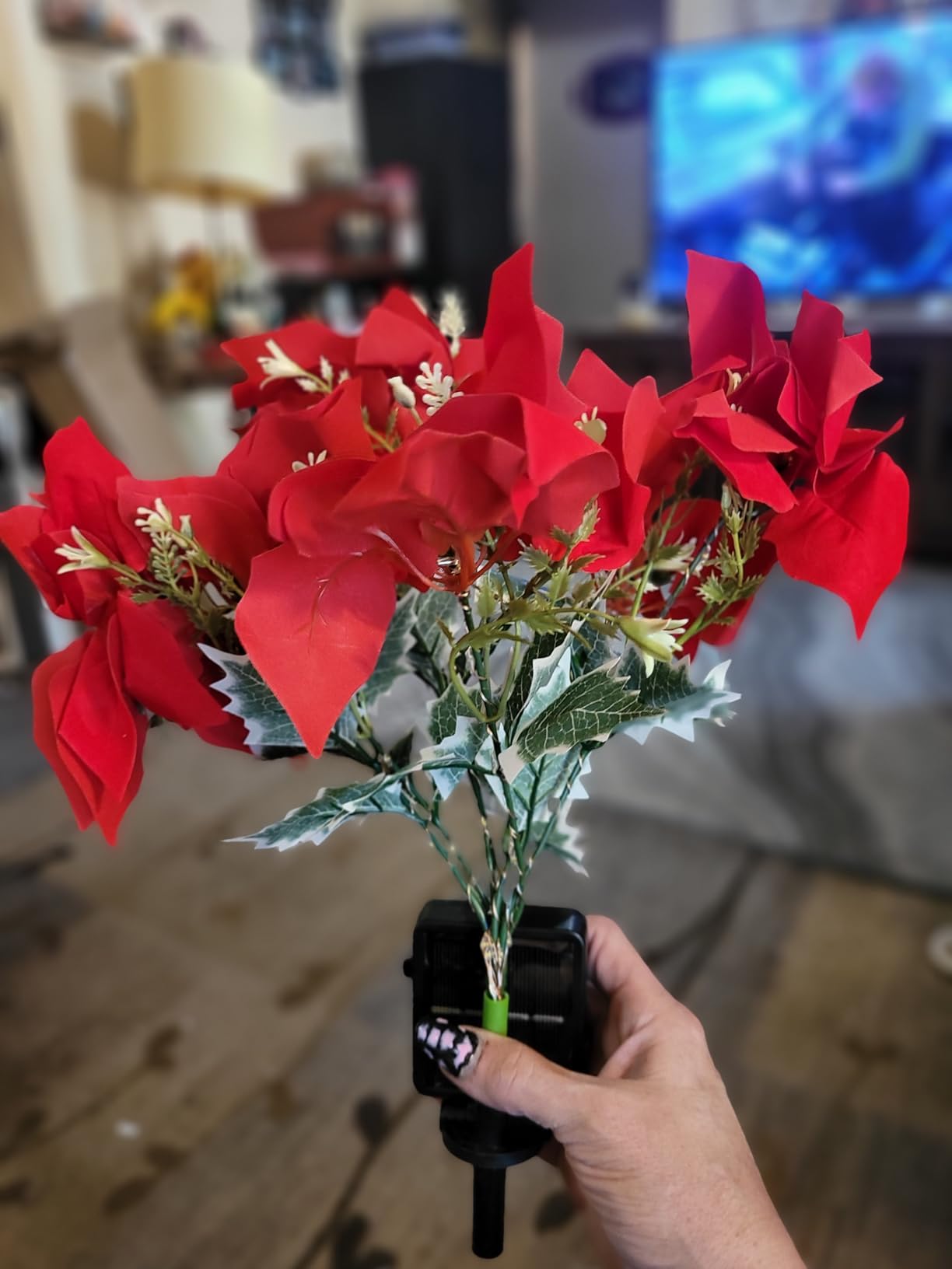 I wasn’t sure how bright they would be, but wow — they exceeded my expectations. The petals look like real Poinsettias, and the warm glow makes my front garden feel so cozy for Christmas. I love that they recharge on their own, so I don’t have to deal with wires or timers.